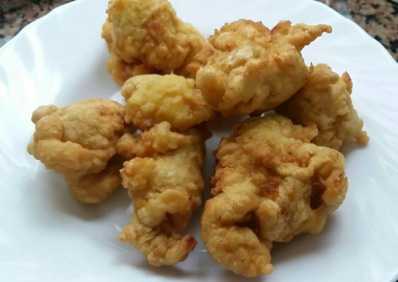- Seguidamente le echamos harina, la que admita, lo movemos todo y tiene que quedar la textura como una papilla, con una cuchara grande cogemos un poco de masa y la freímos en aceite de oliva y probamos si le falta sal le ponemos, normalmente no le hace falta. Freír las tortitas con el aceite no muy fuerte para que no salgan crudas por dentro.