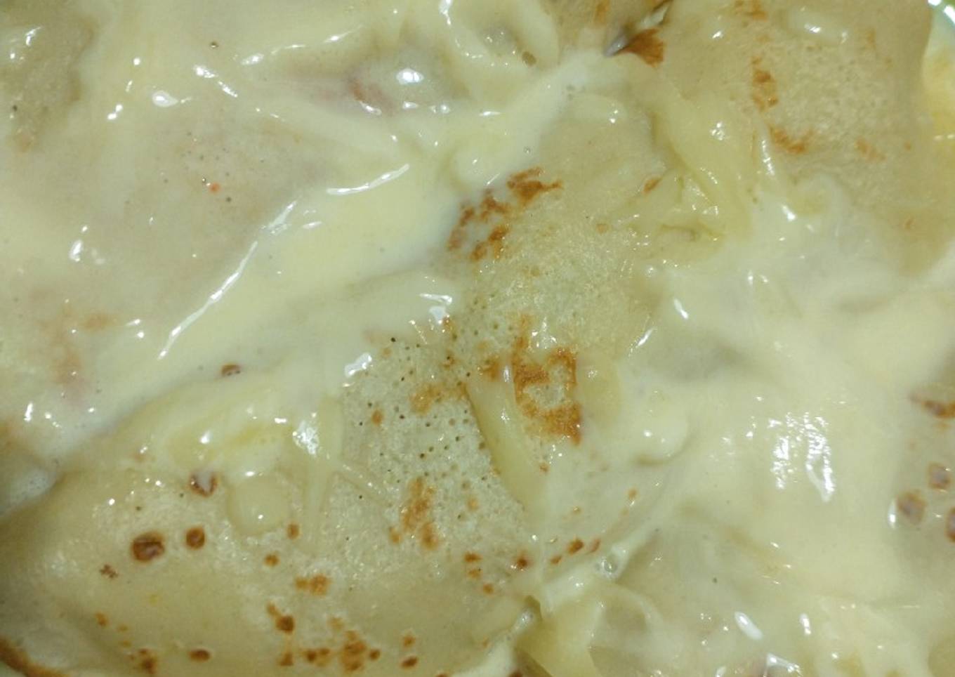 - Poner el relleno en el medio del panqueques (yo puse 2 cucharadas), luego cerrar de un lado y del otro. Quedan como la foto. Rallar queso, poner crema y gratinar en horno o microondas por unos minutos