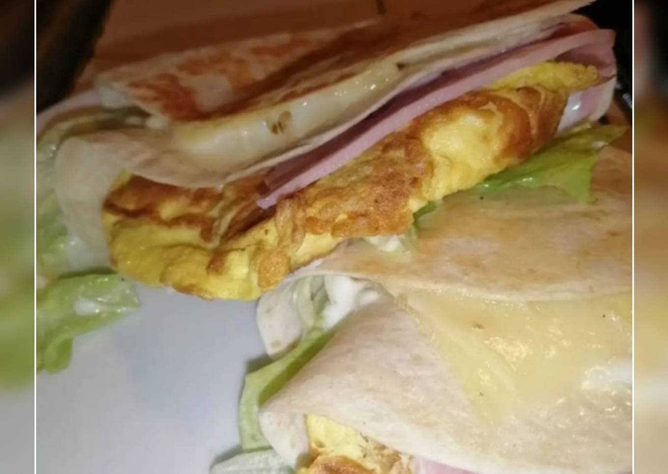 - Colocamos los ingredientes al gusto encima de la tortita, con los 2 huevos hacemos una tortilla francesa que también añadiremos, ponemos un chorro de mayonesa por encima.La doblamos y a calentar.